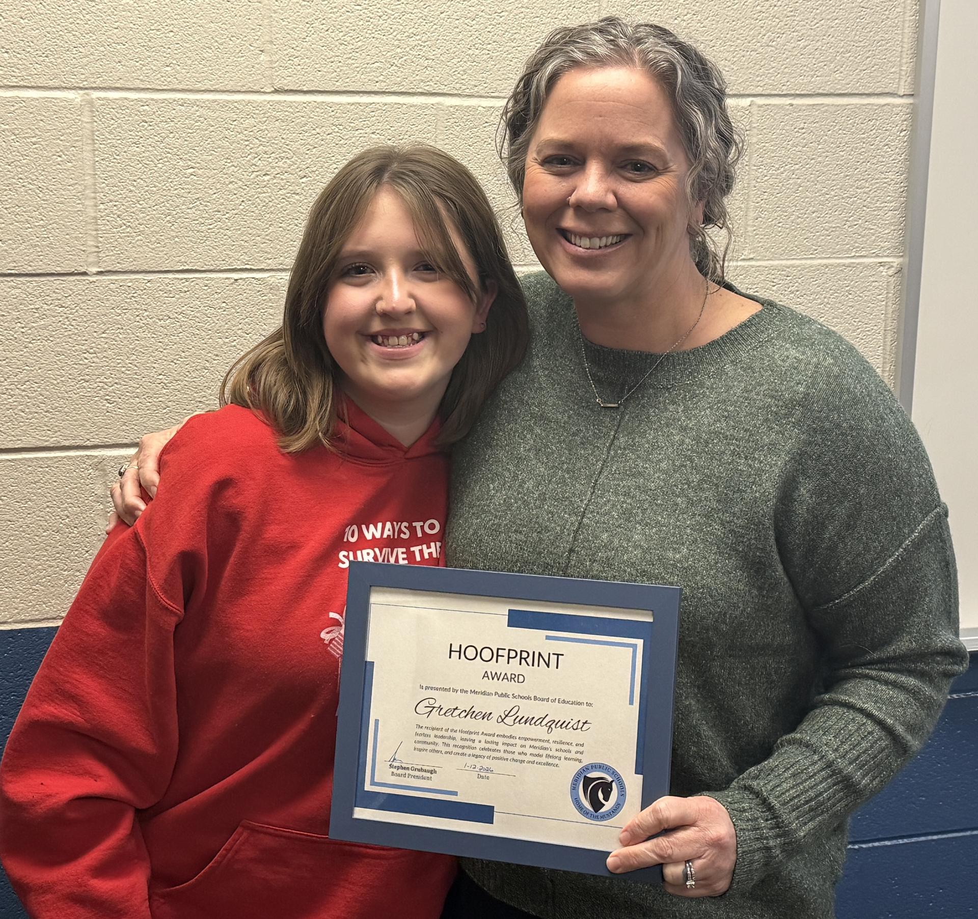 Just as a hoofprint marks the ground with strength and determination, Gretchen Lundquist has left her mark on Meridian Public Schools through her compassion, dedication, and excellence in teaching. Her work continues to inspire students and colleagues alike to push boundaries, embrace growth, and thrive in an ever-changing world.