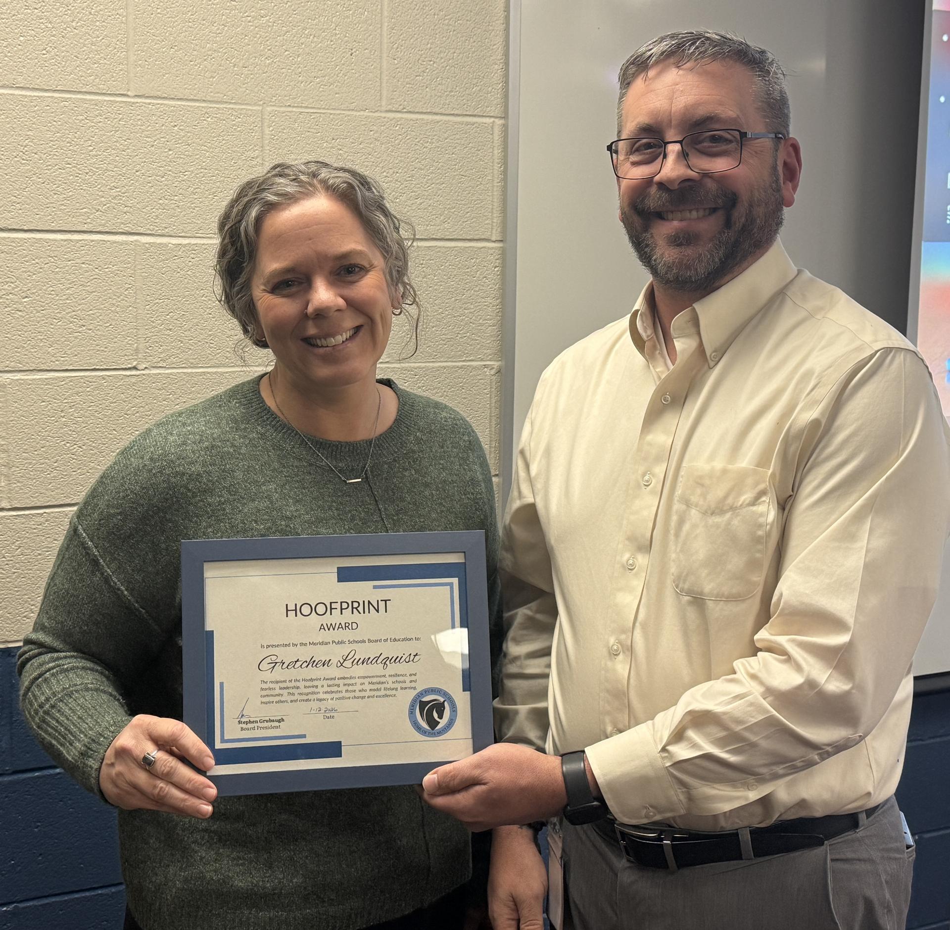 The Mustang Hoofprint Award is a tribute to educators, support staff, directors, administrators, and volunteers who embody the essence of what it means to be a Mustang. They demonstrate courage in facing challenges, resilience in overcoming obstacles, and tenacity in striving for greatness. By fostering curiosity and modeling lifelong learning, recipients like Gretchen exemplify the mission of Meridian Public Schools—to educate and support every student to succeed in their career and life by nurturing curiosity and a love of learning.