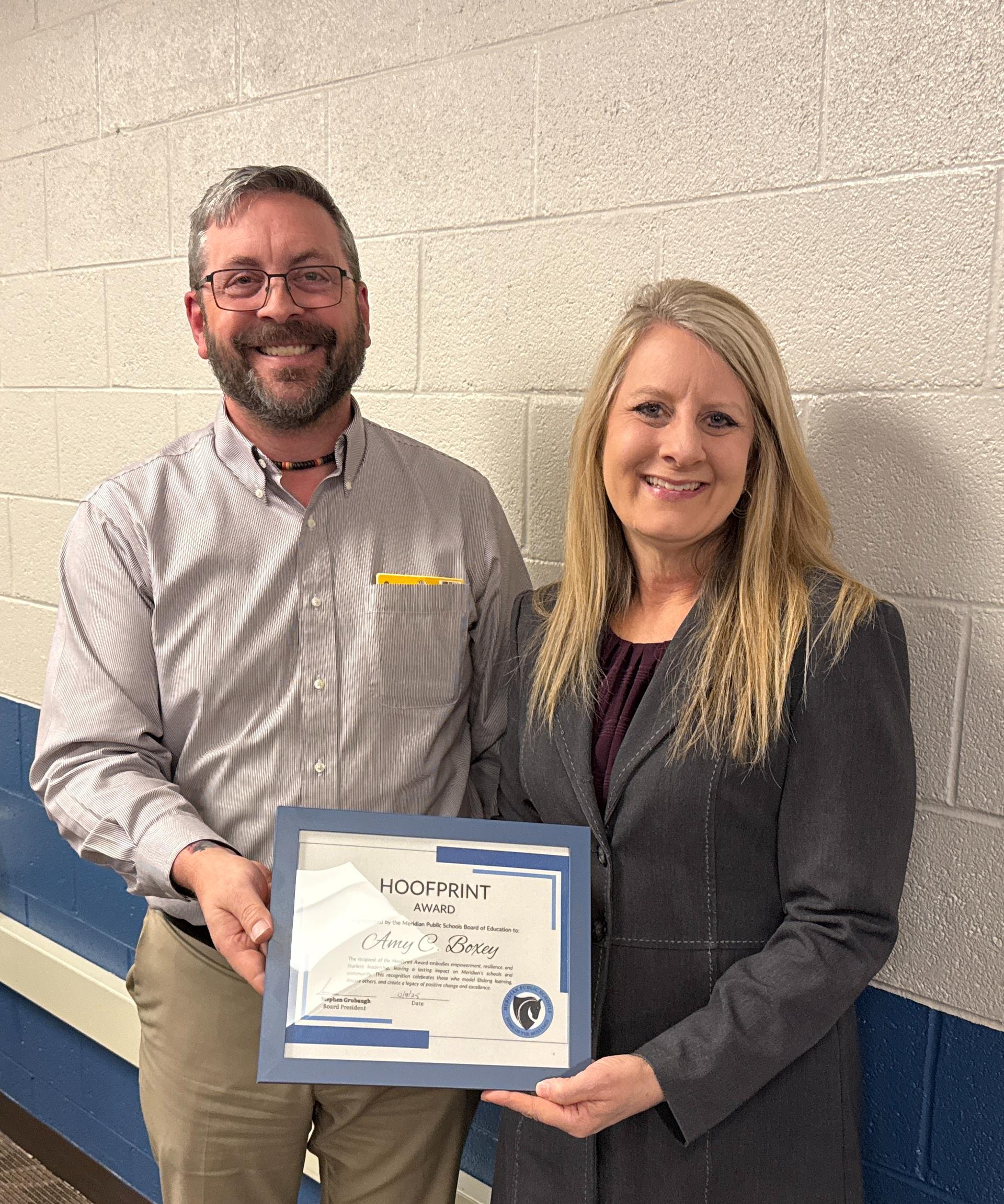 Meridian Public Schools is proud to announce Amy Boxey as one of the December recipients of the Mustang Hoofprint Award—a recognition that stands as a powerful symbol of empowerment, resilience, and fearless leadership.