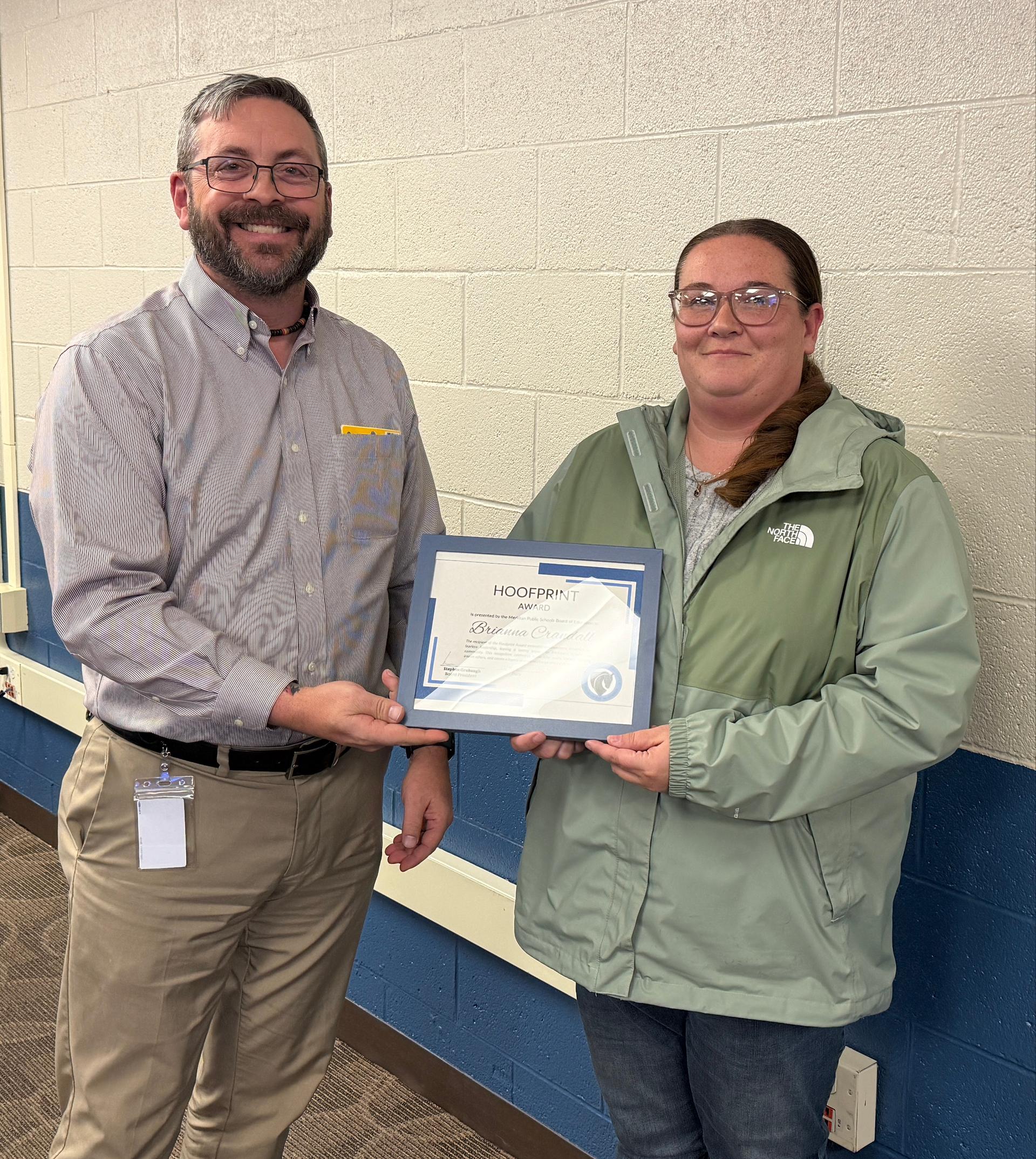 The Mustang Hoofprint Award is a tribute to educators, support staff, directors, administrators, and volunteers who embody the essence of what it means to be a Mustang. They demonstrate courage in facing challenges, resilience in overcoming obstacles, and tenacity in striving for greatness. By fostering curiosity and modeling lifelong learning, recipients like Brianna exemplify the mission of Meridian Public Schools—to educate and support every student to succeed in their career and life by nurturing curiosity and a love of learning.
