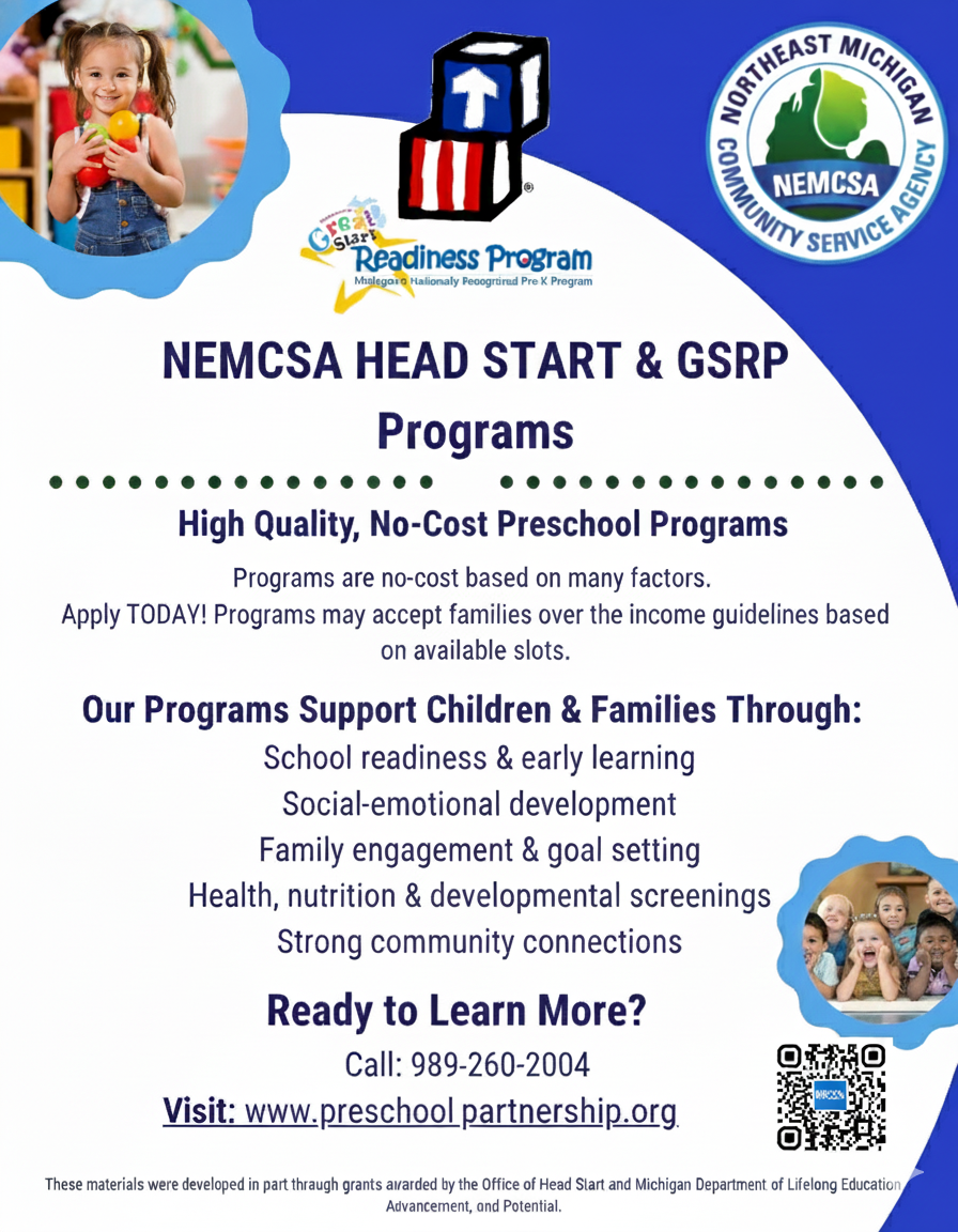 Our Meridian Head Start (3-year-old) and GSRP (4-year-old) programs are officially accepting interest forms for the 2026/27 school year! Did you know your child may qualify for high-quality, no-cost early childhood education through NEMCSA Head Start? Our programs go beyond the classroom to support the whole family, focusing on school readiness, social-emotional growth, nutrition, and developmental screenings. Enrollment is ongoing, and because we prioritize accessibility, families may qualify even if they are over the standard income guidelines. 👉 Apply at www.preschoolpartnership.org or call Julie Sheets at (989) 687-3460.