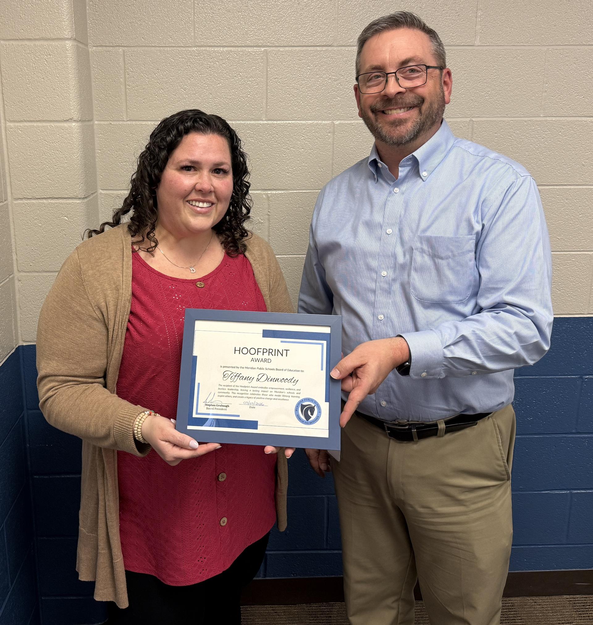 The Mustang Hoofprint Award is a tribute to educators, support staff, directors, administrators, and volunteers who embody the essence of what it means to be a Mustang. They demonstrate courage in facing challenges, resilience in overcoming obstacles, and tenacity in striving for greatness. By fostering curiosity and modeling lifelong learning, recipients like Tiffany exemplify the mission of Meridian Public Schools—to educate and support every student to succeed in their career and life by nurturing curiosity and a love of learning.